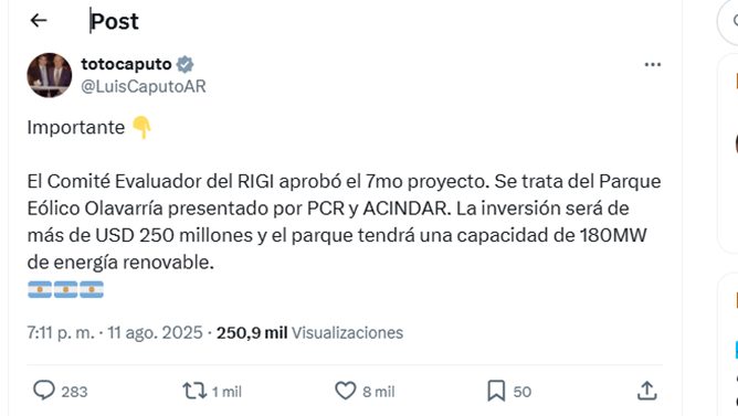 “El Comité Evaluador del RIGI aprobó el 7mo proyecto. Se trata del Parque Eólico Olavarría presentado por PCR y ACINDAR. La inversión será de más de USD 250 millones y el parque tendrá una capacidad de 180MW de energía renovable”, indicó Caputo en sus redes.