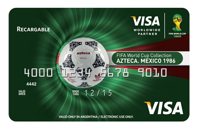 Desde el próximo domingo, los socios Visa podrán adquirir para usar, coleccionar o regalar tarjetas recargables impresas con las pelotas de fútbol usadas en los últimos doce mundiales, que incluye desde la pelota de México 1970, Telstar, pasando por las reconocidas Tango, Azteca y Etrusco, hasta llegar a la que se utilizará el próximo junio en Brasil 2014 llamada Brazuca.
