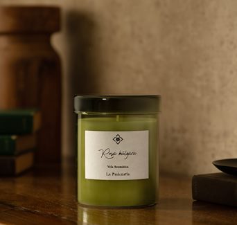 Rosa Búlgara. Se trata de una vela en frasco verde concebida como un objeto de belleza y armonía. Su fragancia revela la nobleza de la rosa búlgara, un perfume que irradia frescura y pureza, envolviendo el aire con un abrazo luminoso.