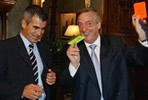 El árbitro argentino, el de mejor actuación en el Mundial de Alemania, visitó al presidente, le obsequió tarjetas y negó incursión en política
