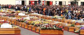 Miles de personas se reunieron ante 205 ataúdes de madera, muchos de ellos cubiertos con flores y fotografías de los fallecidos, dispuestos en cuatro filas en la plaza de armas de una academia de policía en la montañosa ciudad de LAquila, la más afectada por el sismo del lunes de 6,3 de magnitud.