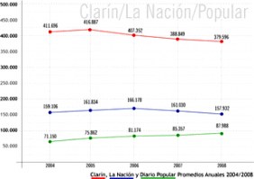 Pese a que apuntan a distintos públicos, en el gráfico se puede observar como, de a poco, Diario Popular se va acercando a los guarismos de La Nación. De continuar la actual tendencia de ventas de ambos matutinos, no sería extraño que en poco tiempo El Popu lo alcance y hasta lo supere.