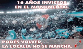 Sobre una foto del estadio de Núñez durante un partido de la Argentina, con el escudo del Club Atlético River Plate de fondo, las leyendas son: "16 años invictos en el Monumental" y "podés volver, la localía no se mancha".
