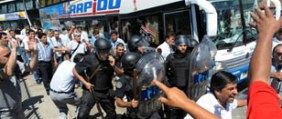 Dos micros de larga distancia que llevaban turistas hacia la Costa Atlántica intentaron atravesar el piquete -que realizaba un grupo de choferes nucleados en la Unión de Conductores de la República Argentina (UCRA)- y fueron apedreados por los manifestantes que bloqueaban la salida de los ómnibus.