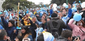 A su vez, miles de personas se congregan en el Obelisco, clásico lugar de festejo de los triunfos nacionales, para alegrarse por el avance a los cuartos de final del Mundial de Sudáfrica 2010, donde los argentinos enfrentarán a Alemania.