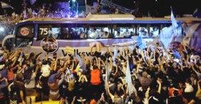 El micro recorrió a paso de hombre los últimos 200 metros de la autopista ante la invasión del público que se concentró con banderas, pantacartas y vuvuselas.