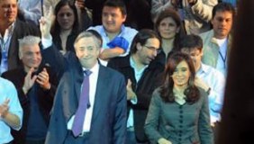 Cristina subió al escenario en reemplazo de su marido, quien aún se repone de la angioplastia a la que fue sometido el pasado fin de semana. Sentado a otros dirigentes del sector, el ex mandatario no se privó de aplaudirla tras cada frase fuerte.