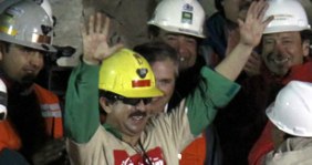 El minero boliviano Carlos Mamani, de 24 años, volvió a la superficie tras estar bajo tierra. Fue recibido por su esposa y el presidente chileno Sebastián Piñera