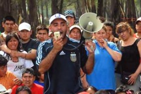 Vestido con camisetas de la selección, una gorra que es casi su sello personal y un megáfono en mano, Salvatierra encabeza la toma de tierra en el parque Indoamericano de Villa Soldati.
