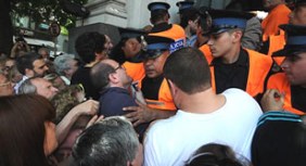 Allí se produjeron incidentes cuando un joven intentó pasar por la protesta con su auto, y tras bajarse y discutir con algunos de los ahorristas, se trenzó a golpes de puño.