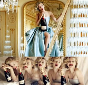 En dos de las tres fotografías difundidas, la neoyorquina se muestra con su melena rubia revuelta y con los labios pintados de rojo furioso, sonriendo junto a la botella de la famosa bodega. Johansson colabora con la marca desde marzo de 2009.