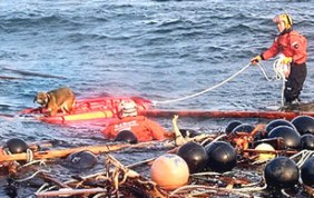Un perro logró mantenerse con vida sobre el techo de una casa, a más de un kilómetro de la costa de Kesennuma y fue rescatado luego de 21 días del Tsunami.