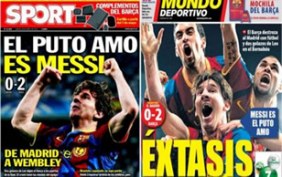 En cambio, los catalanes dispararon la figura de Messi a lo más alto: Leo nos lleva a Londres, sostuvo en referencia al escenario que tendrá la final de la Champions el diario Sport, que luego optó por el título Messi es el puto amo jugando con declaraciones previas de Pep Guardiola.