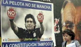 La pelota no se mancha, la Constitución tampoco. Eso dice un afiche anónimo que usa la imagen de Diego Armando Maradona para hacer campaña contra la enmienda constitucional que impulsa el gobernador sanjuanino José Luis Gioja y que ahora ha originado una demanda penal por parte del ex técnico de la Selección.