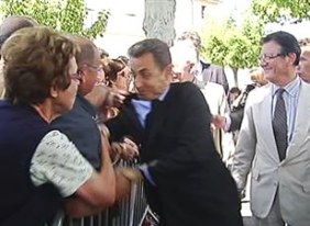Un hombre que salió de una muchedumbre agarró al presidente Nicolas Sarkozy por el saco y casi lo echó al suelo, antes de ser derribado por agentes de seguridad.