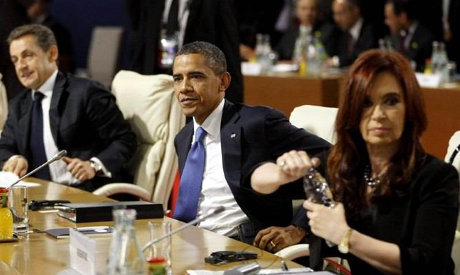 Obama, acompañado de Sarkozy, acudió a saludar a Cristina Kirchner para felicitarle por su triunfo en las elecciones. "Así que, Nicolas, todos tenemos que aprender lecciones" de ese triunfo, bromeó el presidente norteamericano.