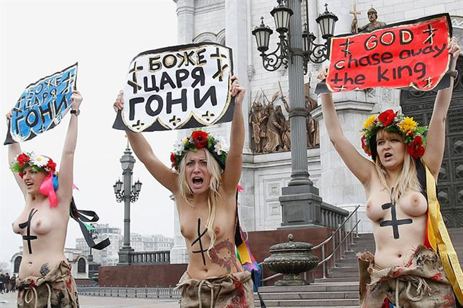 "Dios expulsa al Zar", rezaban las pancartas en ruso e inglés que portaban las feministas que posaron semidesnudas cuando los termómetros marcan hoy varios grados bajo cero en la capital rusa, según las agencias locales. Esa frase es una versión modificada del "Dios salve al Zar" del himno de la Rusia imperial. Las feministas confesaron que habían venido a Moscú para mostrar su apoyo a la oposición rusa en su denuncia de la falsificación de las elecciones parlamentarias por parte del partido de Putin, Rusia Unida (RU).