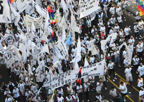 Militantes kirchneristas y de organizaciones sociales, muchos vestidos de blanco, vivaron a la Presidenta ante el Congreso mientras dirigió su discurso ante la Asamblea Legislativa