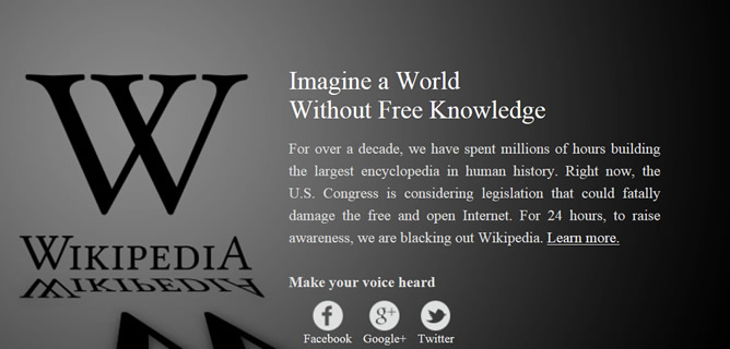 Al intentar acceder a la versión en inglés de la enciclopedia en línea de más de 20 millones de artículos publicados en 282 lenguas, Wikipedia, se desplegaba la frase protestataria sobre una pantalla en negro, que no permitía ingresar al sitio.