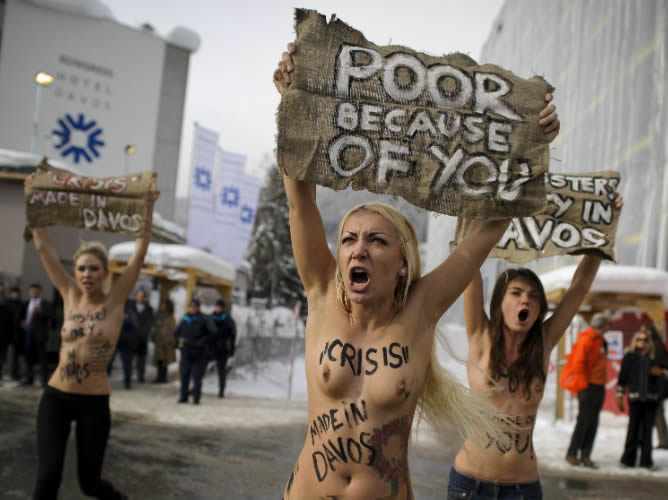 El tradicional Foro Económico de Davos se convirtió en centro de las protestas del grupo radical de feministas ucranianas Fernen, quienes responsabilizan a esos centros de poder mundial por la pobreza y crisis que provocó millones de desempleados.