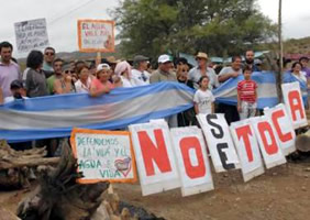 Los ecologistas, entre los que había niños y mujeres, resistían la liberación de la ruta y criticaban a la presidenta Cristina Fernández de Kirchner, al tiempo que arrojaban piedras contra los camiones que se dirigían a la minera.