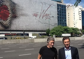 Waters y Macri posaron para la foto frente al mural que el Gobierno porteño desplegó en el edificio Del Plate, sobre la avenida 9 de Julio en homenaje al músico y su obra "The Wall", además de recorrier un centro de la Primera Infancia en una villa de Parque Avellaneda.