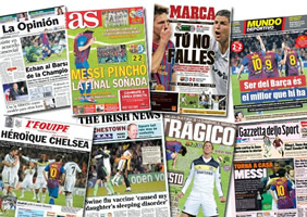 "Messi, vuelve a casa", "Chelsea heroico", "Tú no falles" (en referencia a Cristiano Ronaldo y la otra semifinal que hoy jugarán Real Madrid y Bayern Munich), "Messi pinchó la final soñada, "El muro demolió al fútbol" o "Trágico", son algunos de los títulos que buscan explicar lo que provocó el 2-2 en el Camp Nou.