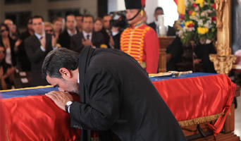 Emocionado, Ahmadinejad fue ovacionado de pie al llegar a la capilla ardiente y mostrar su respeto por su amigo fallecido. También estuvieron el chileno Piñera y el príncipe de España