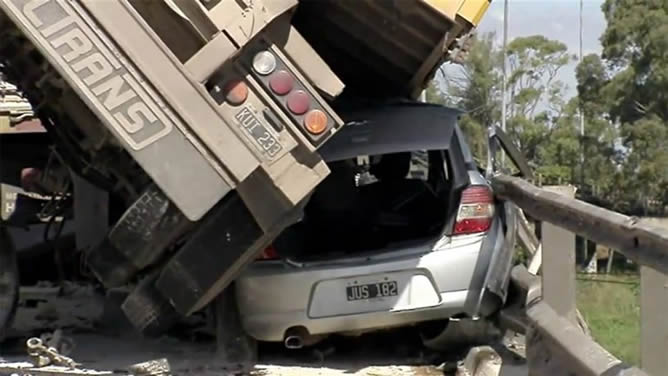 El tremento impacto, que obligó a cortar el tránsito en gran parte del Camino de Cintura, provocó la muerte de uno de los choferes de los camiones y casi aplasta a las cinco personas que iban a bordo de un pequeño auto que quedó al borde del puente.