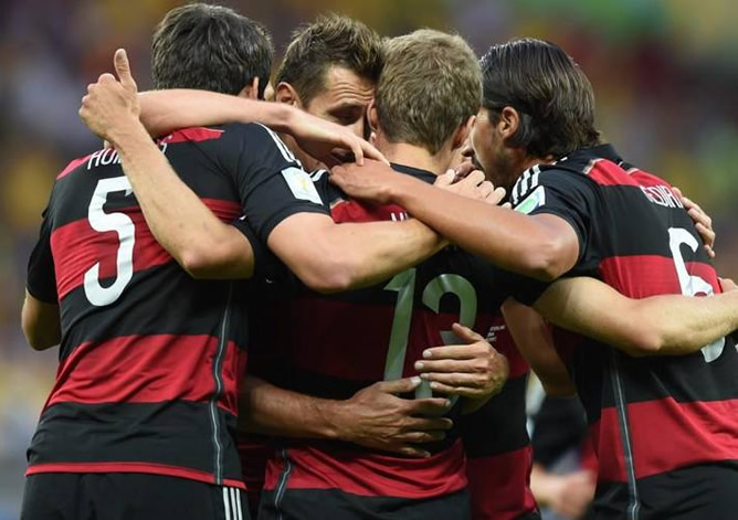 En una primera parte extraordinaria de los alemanes, Thomas Müller (2) abrió el marcador a los 11 minutos y el rodillo germano continuó con los tantos de Miroslav Klose (23), Toni Kroos (24 y 26), Sami Khedira (29) y Schuerrer.