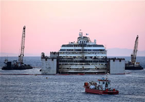 El Costa Concordia, o el "crucero de la vergüenza", ya está siendo trasladado desde las rocosas costas de la isla toscana del Giglio hacia el puerto de Génova, donde será desguazado.