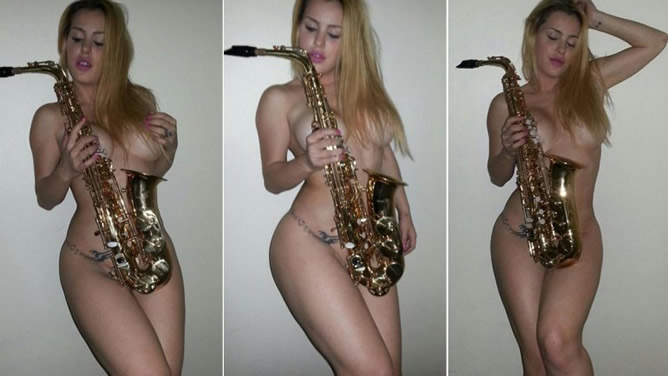 La modelo Mariana Diarco compartió unas imágenes muy hot con sus seguidores de Twitter, donde posó totalmente desnuda, pero cubrió sus partes íntimas con un saxofón.