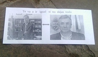 "Te va a ir igual si no dejás todo", advierten unos volantes con una imagen del fallecido fiscal Alberto Nisman y la cara de Morales con la boca tapada. Hará una denuncia penal