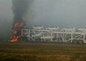 Dos camiones chocaron entre sí y uno de ellos, del tipo mosquito que trasladaba autos cero kilómetro, se prendió fuego, en la mano que va hacia Rosario.