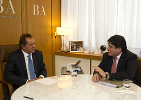 Daniel Scioli y Carlos Zannini, la fórmula presidencial del Frente para la Victoria, compartieron hoy por primera vez un encuentro desde que el gobernador bonaerense anunció que el alter ego de Cristina Fernández lo acompañará en la fórmula que buscará ganar las próximas elecciones presidenciales.