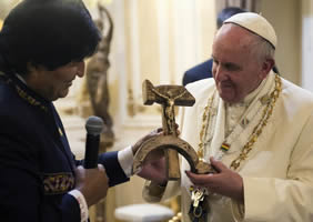 El Papa acababa de llegar a La Paz y tras el gran recibimiento en el aeropuerto y de unos 10 minutos de descanso –porque la ciudad boliviana está a 3.600 metros de altura y eso desgasta la salud de cualquier visitante–, se dirigió al Palacio del Quemado para una reunión protocolar con el mandatario. La transmisión en directo del sitio de YouTube del Vaticano mostró, aunque con sonido ambiente, la pequeña ceremonia en que el boliviano le entregaba obsequios.
