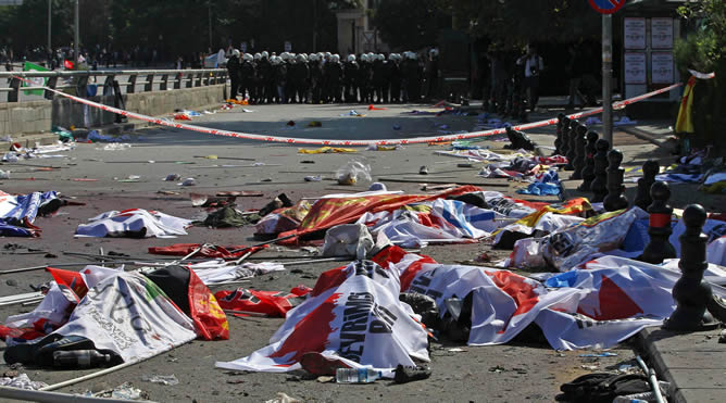 Al menos 86 personas murieron hoy en Ankara en el atentado más grave de la historia turca, perpetrado probablemente por dos suicidas contra una manifestación pacifista de la oposición prokurda, a tres semanas de las elecciones legislativas anticipadas. Dos fuertes explosiones sacudieron los alrededores de la estación de tren central de Ankara, donde debía celebrarse una manifestación opositora en favor de la paz, para denunciar la reanudación hace tres meses del conflicto entre las fuerzas turcas y los rebeldes del Partido de los Trabajadores del Kurdistán (PKK).