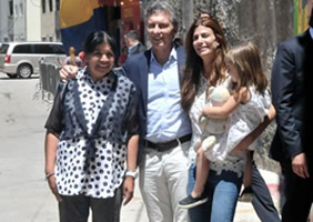 Macri visitó el comedor Los Piletones con su esposa Juliana Awada y su hija Antonia en brazos y un pan dulce para compartir con Barrientos en el comedor ubicado en Plumerillo 3995.
