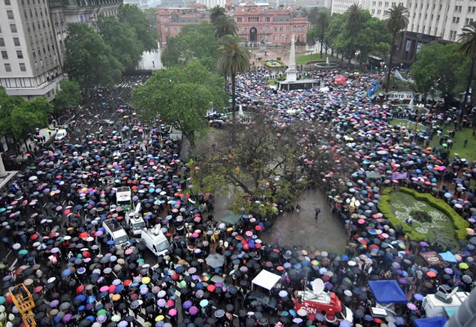 Cientos de mujeres vestidas de negro se encuentran bajo la lluvia protestando contra la violencia a causa de la convocatoria que se decidió realizar luego del terrible crimen de Lucía Pérez en Mar del Plata y que en el mes de octubre hubo 19 femicidios en solo 17 días.