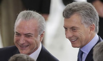 En el inicio de su visita oficial a Brasil, el presidente Mauricio Macri fue recibido por el mandatario brasileño Michel Temer en el Palacio de Planalto, en Brasilia, tras pasar revista al regimiento Dragones de la Independencia que ejecutó los himnos nacionales de ambas naciones. Allí también estuvieron presentes el canciller brasileño José Serra y su par argentina, Susana Malcorra.