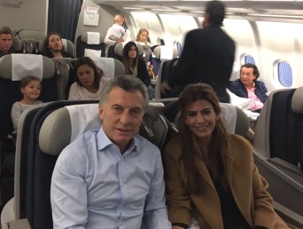 Minutos después de las 19 hora española (15 hora argentina) el jefe del Estado, junto a la primera dama, Juliana Awada, y su hija Antonia, se embarcó en un vuelo de Aerolíneas Argentinas con destino a la ciudad de Buenos Aires, y Presidencia distribuyó fotografías donde se los ve junto a los pasajeros.