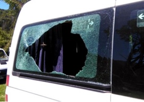 La camioneta que trasladaba al presidente Macri con los vidrios rotos tras el ataque a pedradas en Traful, en diciembre pasado. Fueron militantes políticos y sindicales.
