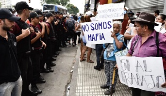 Al rededor de las 7, un grupo de manteros manifestaron que resistirán el desalojo y sobre la avenida Rivadavia se apsotaron con pancartas en las que sostienen: "No somos mafia", o "Queremos trabajar".