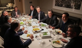 Del otro lado, los recibieron en el despacho del jefe de Gabinete, el anfitrión Marcos Peña, y el ministro del Interior Rogelio Frigerio. Más tarde se sumó el titular de Hacienda, Nicolás Dujovne. Casi a las 21 ya partían todos hacia Olivos, a la cena convocada por el Presidente.