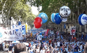 En el primer día de paro en contra de la falta de respuestas por parte del Gobierno a su pedido salarial, los gremios docentes marcharon a la Plaza de Mayo en la primera jornada del cese de actividades y denunciaron un "desfinanciamiento educativo", reclamaron la convocatoria a paritarias nacionales y acusaron al Gobierno de asumir una actitud de "patrón de estancia".