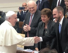 Con Guzmán y Georgieva sentados al lado, la máxima autoridad de la Iglesia Católica pidió que se construyan "puentes que favorezcan el desarrollo de una mirada solidaria desde los bancos, las finanzas, los gobiernos y las decisiones económicas".