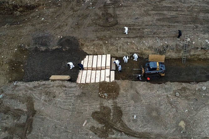 Las imágenes de impacto mundial fueron tomadas desde el aire por un drone de la agencia Reuters que se acercó a la isla frente a las costas del Bronx. Se ve a trabajadores completamente vestidos con trajes y máscaras de seguridad que acomodan en una larga fosa, uno arriba de otro, decenas de ataúdes de madera de pino en un lugar que parece de película de ciencia ficción. Las autoridades de la ciudad confirmaron que la isla, que durante décadas se ha utilizado para dar sepultura a cadáveres sin reclamar, ahora incluirá también a fallecidos por el coronavirus que estén en esa misma situación.
