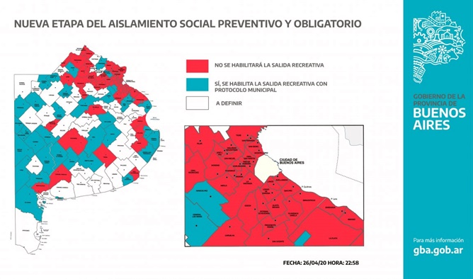 El gobernador de la provincia de Buenos Aires, Axel Kicillof, publicó el mapa de los distritos en los que se podrá salir una hora todos los días "para evitar la proliferación de versiones" sobre este tema.