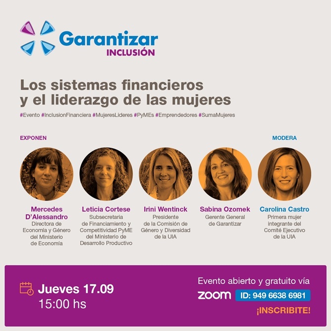 El lanzamiento de "Garantizar Inclusión" se llevará a cabo el próximo jueves 17 de septiembre a las 15:00 hs, con la participación de Mercedes D’Alessandro, directora de Economía y Género del Ministerio de Economía; Leticia Cortese, subsecretaria de Financiamiento y Competitividad PyME del Ministerio de Desarrollo Productivo; Irini Wentinck, presidente de la Comisión de Género y Diversidad de la UIA; y Sabina Ozomek, gerente general de Garantizar. Será un evento virtual moderado por Carolina Castro, la primera mujer en integrarse al Comité Ejecutivo de la UIA y politóloga.