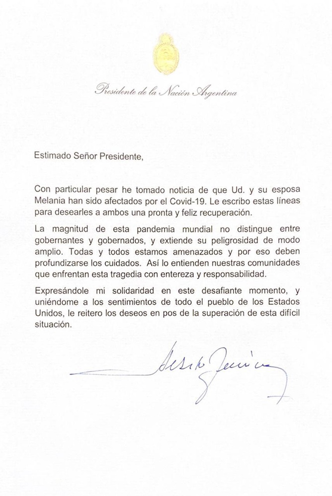El argentino manifestó su pesar por el estado de salud del Presidente republicano y su esposa. “Les escribo estas líneas para desearles una pronta y feliz recuperación”, indicó Fernández, y extendió el apoyo y "solidaridad a todo el pueblo de los EE.UU."